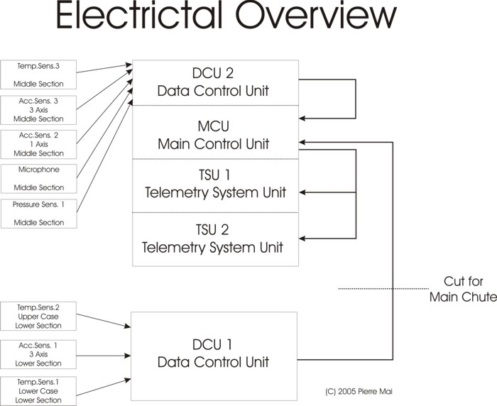 Da ich für den gesammten Elektronischen Tei zuständig bin, möchte ich hier ersteinmal das Grundsystem erläutern: Übersicht: Es sollen verschiedene Messdaten "LIVE" beim Flug vom Explorer zur "Bodenstation" gesand werden. In der Bodenstation werden diese Daten aufgezeichnet, und "LIVE" über ein Programm mit einer Stimme ausgegeben. Die ausgegebenen Audiodaten werden NICHT vordefiniert sein, sondern sich aus einem Pool von Dateien "On demand" zusammengestellt werden. Z.B. wird die Höhe alle xxx Sekunden ausgegeben, wobei dann die Software die passenden Sprachdateien raussichen muss. weiterhin werden als Ausgabe "Seperation Drogue", "Seperation Main" und Touchdown ausgegeben. Weiterhin wird eine Real Audio Übertragung stattfinden, die uns den Sound während des Fluges auch am Boden ausgibt. Im Explorer werkeln dazu diverse Mikrocontoller.... DCU1 (Data Control Unit) und DCU2 sammeln von verschiedenen Sensoren die Daten, und speichern sie, damit sie nach dem Flug bei einer fehlerhaften Übertragung trotzdem weiterhin zur Verfügung stehen. Weitergegeben werden die Daten "Realtime" an die MCU Die MCU (Main Control Unit) Nimmt die Rohdaten der DCUs auf, und bereitet sie für die Weitergabe an die TSUs auf. Die TSU (Telemetry System Unit) sendet die Daten an die Bodenstation. Weiterhin ist bis zum Start die TSU2 als Rückkanal vorgesehen. Die TSU2 empfängt bis zum Start von der Bodenstation Kommandos, womit Diverse Zustände "On Demand" abgefragt werden können wie z.B. den Status der Zünder, die "Gos" oder "NOGOs" der einzelnen Systeme. weiterhin wird der Start nach Überprüfung alles Systeme von der Bodenstation eingeleitet. Anzumerken sei hier noch die DCU1, welche die Daten nach der Trennung vom Main ja nicht weitergeben kann an die MCU. Diese Daten sind jedoch nicht verloren, sondern werden On Board gespeichert, und stehen nach dem Flug zum auslesen bereit. Sooo, bei weiteren Fortschritten werde ich hier natürlich auch Posten! viele Grüße Pierre zur Übersicht heir einmal ein Diagramm : Geändert von CharlyMai am 18. November 2005 um 09:51 •"Der Glaube an eine bestimmte Idee gibt dem Forscher den Rückhalt für seine Arbeit. Ohne diesen Glauben wäre er verloren in einem Meer von Zweifeln und halbgültigen Beweisen." Konrad Zuse •Konstruiere ein System, das selbst ein Irrer anwenden kann, und so wird es auch nur ein Irrer anwenden wollen. SOLARIS-RMB e.V. AGM |