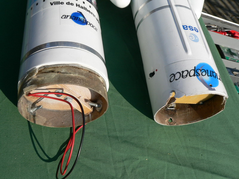 Das andere Problem war der Fallschirmschock. Die Ariane flog durch den Ausfall des zweiten Boosters eher eine Parabel. Beim Ausstoß des ersten Fallschirms nach Durchgang des Apogäums war der Schock so groß, dass die drei Befestigungsschrauben ausbrachen und die gesamte Oberstufe sich allein auf den Weg nach unten machte. Hier der gesamte Schaden zur Begutachtung Glück im Unglück - die Spitze ist heil geblieben. Der Aufschlag am Boden muß durch den Schnee gedämpft worden sein. Klar kann man das reparieren. Aber ich werde die 15cm Verlängerung der Ariane wieder zurückbauen. Die Hebelwirkung der verlängerten, schweren Spitze ist beim Fallschirmausstoß dann doch zu groß. Im allerschlimmsten Fall würde vielleicht sogar die Rakete in der Mitte, wo sich die seitliche Fallschirmkammer befindet auseinanderbrechen. Und das käme dann einem Totalschaden nahe. Ciao, Rolli - der nun wieder was zum basteln hat