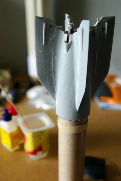 Diese Baugruppe wurde jetzt in das Unterteil gepoxiet. Man sieht auch, dass ich einen Spalt für den Mothaken unter der Hutze gedremelt habe. Folgende Datei wurde angehängt: