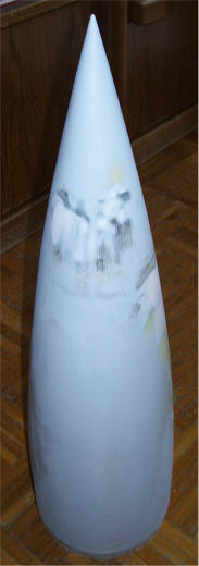 Hi! Vielen Dank noch für eure netten Antworten, das motiviert zu den Reparationsarbeiten an der A4 ;-) Nun gut, dann hole ich mal eben den ersten Teil des Bauberichts nach! Beginnen wir mit der Spitze: Von Vornherein war klar, dass ordentlich Gewicht in der Spitze nötig werden würde, um einen stabilen Flug zu gewährleisten. In der Theorie (Rocksim) erschienen 2kg als passend und wie sich vor kurzem zeigte, ist auch in Natura diese Masse in der Spitze nötig, um ein sicheres CG/CP Verhältnis bei der Verwendung größerer Motoren zu erhalten. Erreicht wurde das ganze mit Biresin/Blei ganz oben, gefolgt von jeder Menge „Eisenschrott“ und Epoxy und Schaum, viiiel Schaum. In etwa 300g gingen in den Zwischenraum vom 4“ PML Rohr zur (max.) 190mm Außenwand der GFK Spitze. Das von außen verglaste PML Innenrohr besitzt übrigens einen 10mm dicken Sperrholzspanten, an dem ein U- Bolt mittig befestigt ist. Er dient zur Befestigung der Fallschirm- Peripherie. An dieser Stelle möchte ich an das Bild vom kleinen "Kampf" erinnern. Hinter den ausgebesserten Blessuren an der Spitze verbirgt sich eine Geschichte. Da ich nicht mehr genügend Biresin für die Spitze zur Verfügung hatte, musste ich auf Epoxy umsteigen. Ganz klar, dass man für solche Füllarbeiten kein hochwertiges Epoxy benutzt und so kam es dazu, dass diese Sauce trotz Wasserkühlung von aussen (stand in einem vollen Eimer Wasser) so heiß wurde, dass es das knapp 1,5mm dicke GFK mit bis zu 3mm tiefen Dellen (Gott sei Dank nach innen) stellenweise verformt hatte! Oh das war schon etwas zum Haare ausrauffen, das ansehen zu müssen.