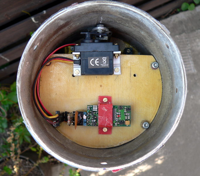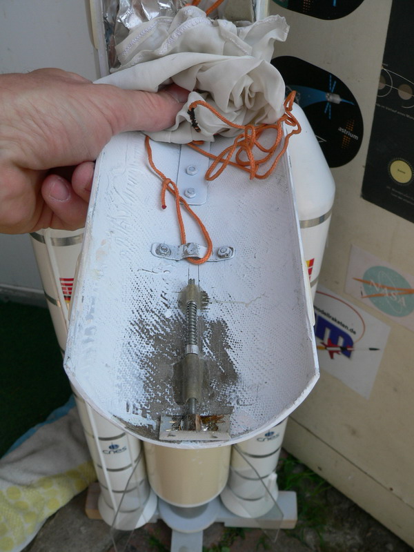 Bilder auf meiner HP Nun bin ich wieder am umbauen, weil ich es leid bin, die Pyroladung zu preppen, den SALT abdichten zu müssen und die SP-Sauerei in der Spitze nach jedem Flug. Bin schon länger zum Fan von Servomotoren bei der Bewerkstellung von Klappenöffnungsmechanismen geworden. Nun werde ich einen SALT mit der neuen Möglichkeit einer Ansteuerung eines Servomotors für die Ariane benutzen. Der Umbau war nicht so kompliziert... Die Klappenmechanik wurde ja im Wesentlichen beibehalten, nur dass jetzt ein Servomotor den Verschlußbügel hoch hebt, statt des kleinen Kolbens, welcher vorher den Verschlußbügel hochgesprengt hatte. unter dem Spant befindet sich ein Akku aus 6 Zellen (7,5 V) mit von außen zugängiger Ladebuchse. Das Gegenstück des Verschlußhebels wurde beweglich gemacht, so dass man von außen trotz verriegeltem Hebel die Klappe mechanisch öffnen kann. Demnächst folgen Bodentests... Grüße, Rolli |