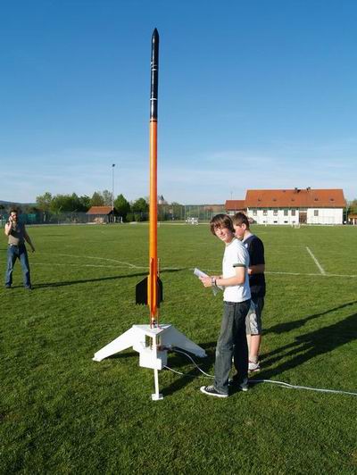Um Punkt halb sieben war es dann soweit. Rakete auf 12,5bar Startdruck, Fallschirmkammer scharfgemacht! Nur noch einmal kurz den Startknopf drücken und weg ist sie...