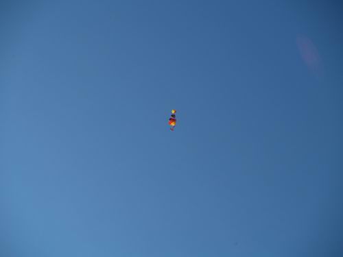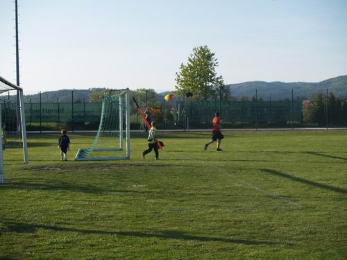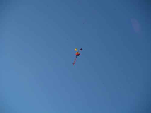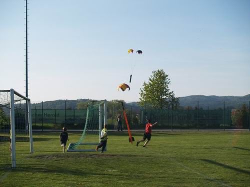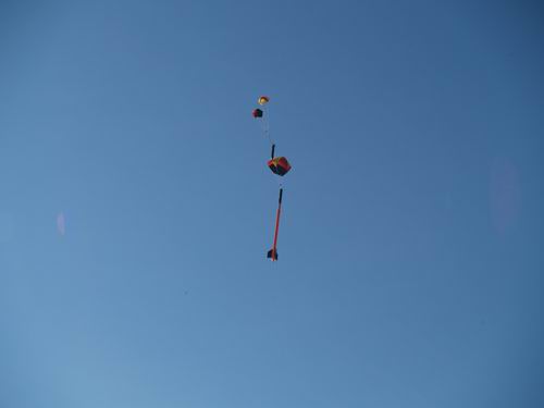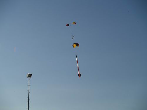 Sie startete Kerzengerade und schraubte sich höher und höher in den Himmel! Am Gipfelpunkt 2 kleine Pünktchen neben der Rok. Es waren die Fallschirme!! Juhuuuuuuu!! Dann machte es flapp und flapp! Beide Schirme öffneten sich perfekt. Nachdem die beiden die Rok wieder in eine gerade Position gebracht hatten machte es flopp und der große Hauptschirm kam. Nach kurzer Sinkzeit landete sie keine 15m von der Startrampe entfernt und hätte fasst ein Fussballtor erwischt!