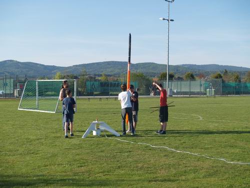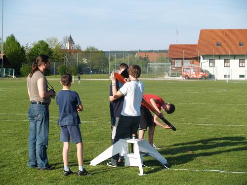 Um ungefähr halb sechs bin ich und meine Kumpels am Startplatz angekommen und haben gemütlich angefangen alles aufzubauen. Es dauerte keine 15min dann waren Eltern, Verwandte und Bekannte auch anwesend. Als erstes machte ich eine kleine Demo für die Gäste mit meiner Tennisballrakete. Dann war die Große Dran! Nach knapp 30min Startvorbereitung wurde dann endlich der Kompressor angeworfen. Nebenbei natürlich nochmals die Checkliste durchgegangen. Nach ungefähr 10min hatte er die Rok auf 9bar. Dann wollte ich mit der Hand weiterpumpen um ein Gefühl für den Druck zu kriegen. Das kann ganz schön schweißtreibend sein!