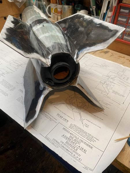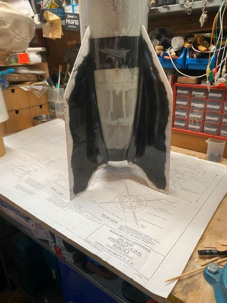 Ich bin etwas voran gekommen mit der A4 und so möchte ich Euch den aktuellen Zustand nicht vorenthalten. Finnen und Körperrohr kommen zusammen stand auf dem Plan. Und zwar so, wie vom Erbauer der Form und von Roman erfolgreich verifiziert, an das Körperrohr angeklebt..... Nun ist "Finnen einfach ankleben" ja eher etwas aus dem Low-Power Bereich, und harmoniert keinesfalls mit der geplanten Motorisierung im J-Bereich, aber ich vertraue da mal ganz Romans Erfahrung und betrete da (für mich) mal komplettes Neuland. Romans Empfehlung bezieht sich dabei auf die Wahl eines geeigneten Klebers. In meiner Welt hätte ich die Finnen mit angedickter Epoxi/Glasballonmatsche angeklebt, und aus meiner Erfahrung heraus sind die Nähte und Fillets so starr, das sie bei der erstbesten seitlichen Belastung dann einfach abbrechen oder aufbrechen. Die "erstbeste seitliche Belastung" bei einer Rakete mit dermaßen nach hinten überstehenden Finnen wäre dann auch gleich die erste Landung Heck-voran am Fallschirm hängend. Wie das immer so ist, fällt das Geraffel ja nicht in die Wiese, sondern trifft den steinharten Fahrweg neben der Wiese. Meine 4" TinTin Rakete und die 3" Jayhawk (obwohl bei weitem nicht so groß) können da ein Lied von singen. Alle vier Finnen wurden sauber entgratet, der Schaum passend runtergeschliffen und die Klebeflächen amtlich angeraut, sofern nicht durch das Abreissgewebe schon rau genug. Die Empfehlung lautete, ein langsamer oder mittelschneller, zähelastisch aushärtender Kleber auf Epoxyd-Basis. Im Raum standen da zB 3M ScotchWeld DP490 oder Araldite 20irgendwas von Huntsman. Das 3M Zeug kostet in der 50ml Doppelkartusche um 40€, gehts noch? Das Araldite-Zeug war mit 23€ wesentlich günstiger und so wurden zwei Kartuschen angeschafft, inkl. Dosierpistole und einem Dutzend Mischdüsen zum Einmalgebrauch. Für den Klebevorgang kam das präparierte Bodenbrett und der 3D gedruckte Ausrichtefuchs zum Einsatz. Ich bin restlos begeistert. Zum Einen natürlich vom Ergebnis, zum Anderen von dem Klebezeug. Sauber zu applizieren, langsam genug um sauber und überlegt zu handeln, schnell genug, um 30 Minuten später mit der nächsten Finne weiterzumachen. Überhaupt kein Vergleich zu 5 Minuten Epoxi. Außerdem absolut bombenfest, aber spürbar flexibel. Ohne mir weitere Gedanken zu machen würde ich da (wie geplant) guten Gewissens einen mittleren J-Motor reinstecken. So begeistert übrigens, das die Wracks der TinTin und der Jayhawk auch gleich noch ein paar Klebenähte verpasst bekommen haben. Das verspricht eine endlose Lackiererei zu werden, wenn hier alles fertig ist, was ich auf dem Tisch habe. Aber ich schweife ab, zurück zur A4. Ab jetzt ist zweifelsohne zu erkennen, was es werden soll. Das kann sich doch sehen lassen!? |