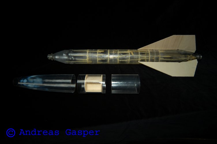 @ pmbond: Die ganze Rakete ist so geplant worden, dass jeder sie mit etwas handwerklichem Geschick und einer vernünftig ausgerüsteten Werkstatt nachbauen kann. Für die Spitze ist die Methode mit dem Urmodell geplant. Also ein Holzmodell der Spitze drechseln, eine 1,5-Liter-Einwegflasche mit einem Heißluftfön draufschrumpfen und dann abziehen. Das Loch in der Spitze, wo vorher der Flaschenverschluss saß, wird mit einer Plastikkappe verschlossen und dann die Spitze etwas mit PU-Schaum ausgeschäumt, damit die Plastikkappe hält. Daher der Schaum.