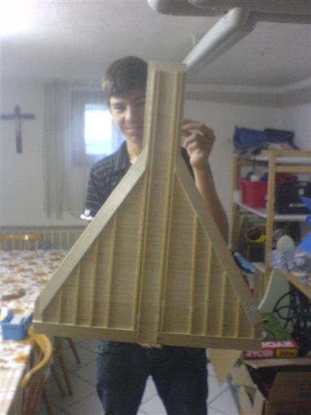 Hey Robby! Danke für deine Antwort. Nein so wie du ihn auf dem letzten Foto siehst, ist er im Moment bei mir im Keller. Die Längsstreben halten genau die im 90° Winkel laufenden Balsaplatten zusammen. Querstreben werde ich aber auf jeden Fall noch einbauen. Und verglast wird das ganze dann ja auch noch. Ich hoff mal das, dass ganze dann halten wird. Wie ich den Akku verbaue weiß ich noch nicht so genau. Brauche ja 4 AAA Zellen. Ich denke aber ich werde 2*2 AAA Päckchen jeweils in einen der beiden Flügeln verschiebbar unterbringen. Oder einfach in der Mitte über dem Tank...naja weiß noch nicht so genau wie ich das machen werde. Jetzt als nächstes muss ich erstmal wieder Flaschen für den Tank besorgen. Volumen weiß ich noch nicht. Denke mal so 1,8l. Das mit dem Akku werde ich mir aber auf jeden Fall merken! Gruß Andy