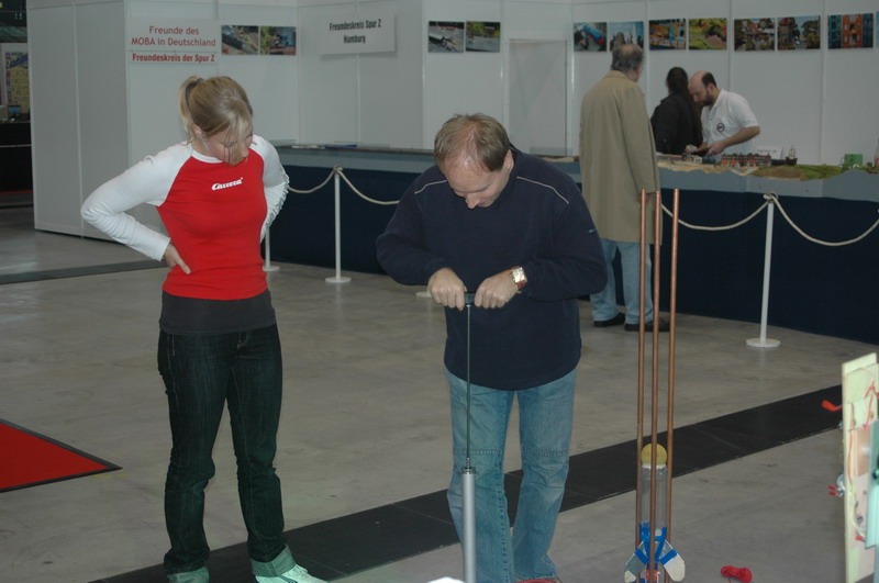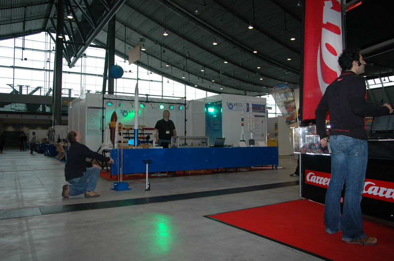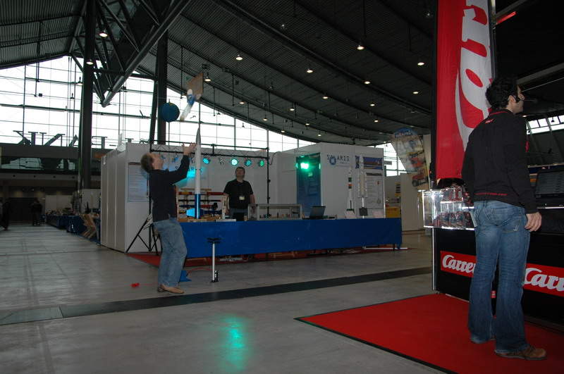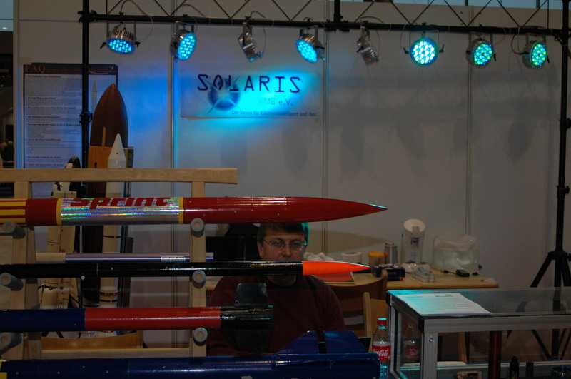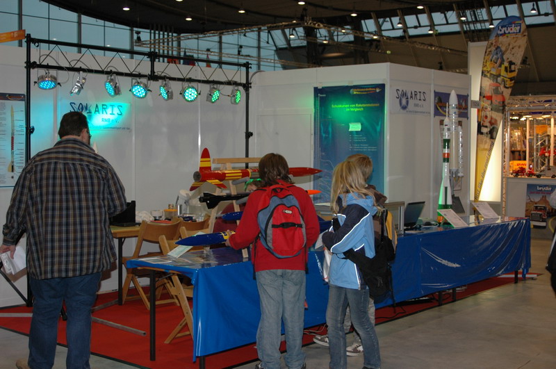 Standbesetzung: Uli Nieland, Oliver Seltmann und Pierre Mai.... auf den Studenten Oliver Ahrend wird noch gewartet ... *fg* Gleich am frühen Morgen ersteinmal der netten Frau vom Carrera-Stand gegenüber die Funktion einer Wasserrakete erklärt: Auch die Carrera Leute machen Spässle: Suuuch ... ahh Fangen : beim verlassen der Rampe: einige Zuschauer am frühen Morgen: •"Der Glaube an eine bestimmte Idee gibt dem Forscher den Rückhalt für seine Arbeit. Ohne diesen Glauben wäre er verloren in einem Meer von Zweifeln und halbgültigen Beweisen." Konrad Zuse •Konstruiere ein System, das selbst ein Irrer anwenden kann, und so wird es auch nur ein Irrer anwenden wollen. SOLARIS-RMB e.V. AGM |