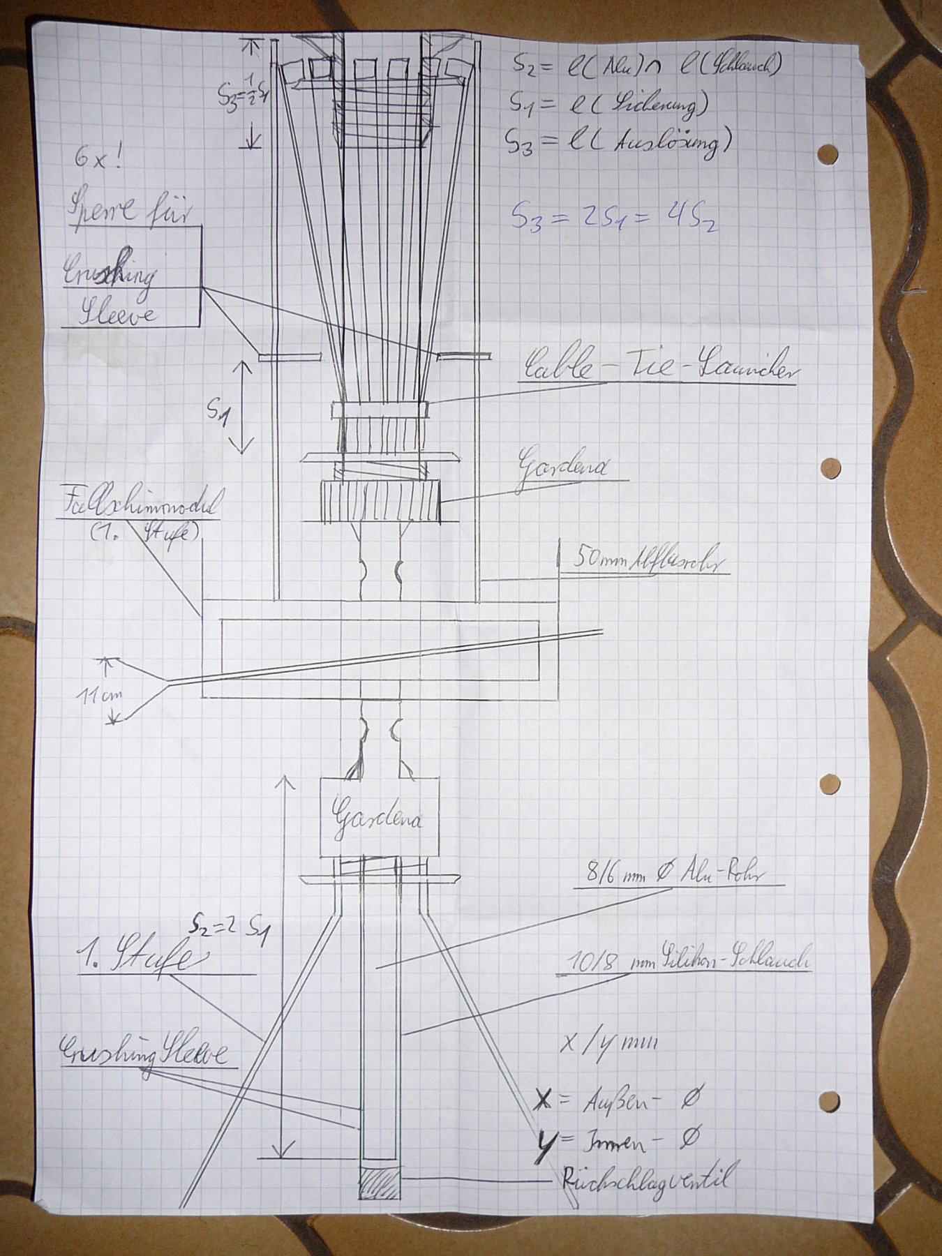 endlich ist es soweit. Ich hab wieder eine Technik entwickelt - diesmal wirklich entwickelt wobei die Idee klar war und ich mir die technische Umsetzung überlegen musste - bei der ich all meine Höhenrekorde wieder brechen kann! Aber zunächst zur Sache! Ich geh mal davon aus, dass es jemand ausprobieren will. Hier ist die Zeichnung mit beschriftung in großer Ausführung (1800x1350) So fing es an: Ich habe mir das System überlegt, wobei apflstrudl an der ein oder anderen Stelle konstruktiv mitgewürgt... mitgewirkt hat ![]() Also der Aufbau: Man sieht unten die 1. Stufe mit normalem Crushing Sleeve drin. Darüber sitzt das Fallschirmmodul. Es ist nichts neues dran deswegen die kompremierte Darstellung. Es funktioniert SO! am Ende des Crushing Sleeve sitzt jetzt keine flasche sondern der Cable Tie Launcher. Und so funktionierts: Der Crushing Sleeve funktioniert wie gewohnt und schiebt praktisch den Cable Tie aus dem Rohr. Dieser löst dadruch aus! So jetzt der Bau: wie die Kappe im letzten Bild hingehört, sieht man ja auf den vorherigen Bildern. ERGEBNIS: Ich hab schon einmal geschossen: 5 bar , Rakete: 4,5 L +1,5L beide 20 mm Düse; 60 und 15 cm Launchtube Die Rakete war etwa 110 bis 130 Meter hoch! Ich hab sie am höchsten Punkt kurz aus den Augen verlohren, da es nur eine kleine 1,5er Tennisballrakete war so hoch war noch keine einzelne 1,5er.Die Höhe (bei 5 Bar) war vergleichbar mit ein paar guten Schüssen mit meiner 2,9 L(mit 10 Bar) : (Die hier ) Der Flug: Beim Start war das ding etwas träge für 20mm, aber sie stieg senkrecht und doch zügig. Dann in 15-20 m Höhe gab es 2 mal einen lauten Knall! Das erste war die 2. Stufe die auslöste und das 2. war der riesen Stein der mir vom Herzen viel! ![]() So und nun seit ihr dran Verbesserungsmöglichkeiten sind mir lieber als Kritik, aber ich nehm beides ![]() So long, Twister ... der versucht mit eine 2-stufigen 9,5L + 4,5 L die 250 Meter zu knacken! Geändert von Twister am 15. Mai 2007 um 16:49 Mich bedrückt die Vorstellung aus dem Hinterteil einer Rakete zu trinken! |