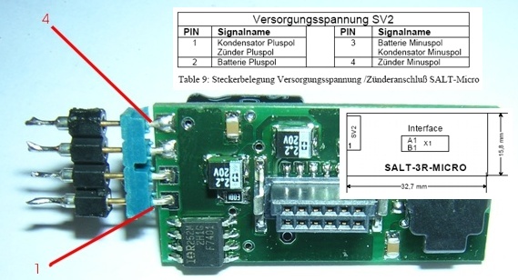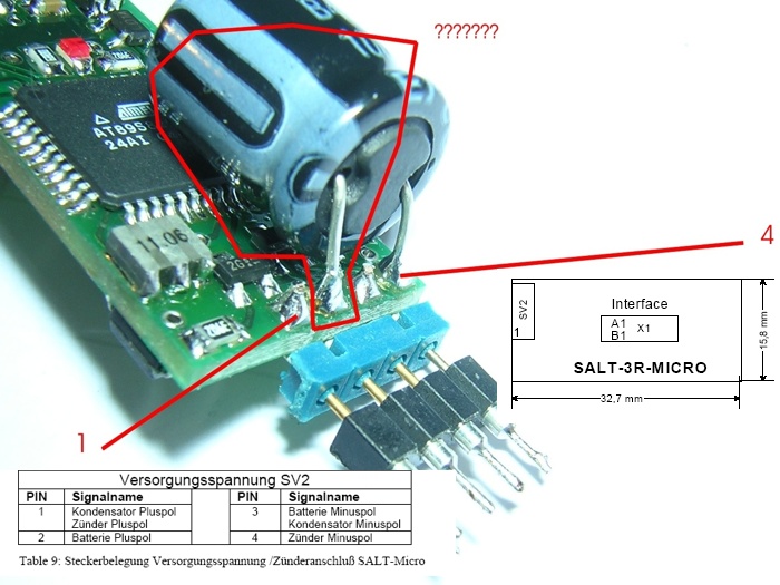 Pin 1 der Kondensator Pluspol sitzen ..... Pin 2 dann Batterie Pluspol ..... da sitzt bei mir aber Kondensator Minus .... Pin 3 sollte batterie Minus sein .... Pin 4 sollte Zünder Minus sein ... bei mir Kondensator Pluspol ... Entweder ist bei mir der Kondensator falsch eingelötet, oder Pin 1 vom SALT Micro sitzt nicht unten, sondern oben ... Bitte um schnelle Hilfe .... Danke Pierre siehe Bild : Folgende Datei wurde angehängt: •"Der Glaube an eine bestimmte Idee gibt dem Forscher den Rückhalt für seine Arbeit. Ohne diesen Glauben wäre er verloren in einem Meer von Zweifeln und halbgültigen Beweisen." Konrad Zuse •Konstruiere ein System, das selbst ein Irrer anwenden kann, und so wird es auch nur ein Irrer anwenden wollen. SOLARIS-RMB e.V. AGM |