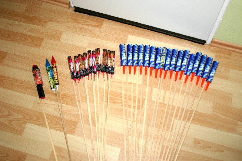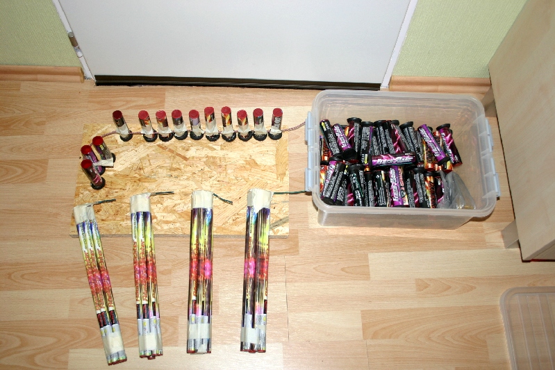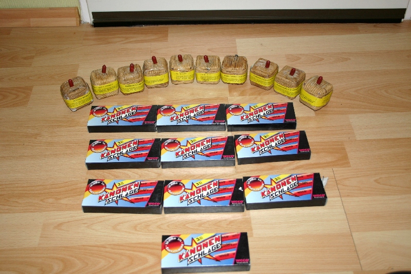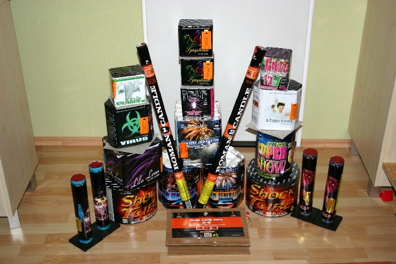 Auch ich wünsche Euch allen einen guten Rutsch ins Jahr 2013 und das noch weniger Modellraketen kaputt gehen. Hier mal mein Silvestereinkauf ( auch hier hat die Regierung schon gemotzt  ) Alles zusammen  Kleine Raketenauswahl ( Fast nur Knallraketen, den Rest zum Testen ) Gut das man diese Raketen kaufen darf Ich habe da mal vorbereitet Krabbelkiste nur mit KnockOuts und Flash Bangs Selbstgebaute Knallkette Kleine Böllerauswahl Und das Finale Was jetzt noch fehlt, ist ein Zink Premium - Raketensortiment und noch eine Schachtel Lesli HeadBanger