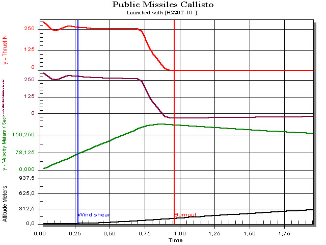 Salü Rainer Ich habe mal kurz die Daten meiner meiner PML Callisto nachgerechnet. Auf dem schwächsten üblicherweise geflogenen Motor (H128W) hat sie bei Brennschluss -3.5g! Bei einem H220T ist sie bei Brennschluss sehr viel schneller, damit wird die Beschleunigung noch grösser (ca. -5.5g). Dabei ist zu bemerken, dass die Callisto relativ schlank (58mm bei 1.2m Länge) und schwer (ca. 1kg) ist - also der Typ, der am geringsten bremst. Siehe Bild. Folgende Datei wurde angehängt: