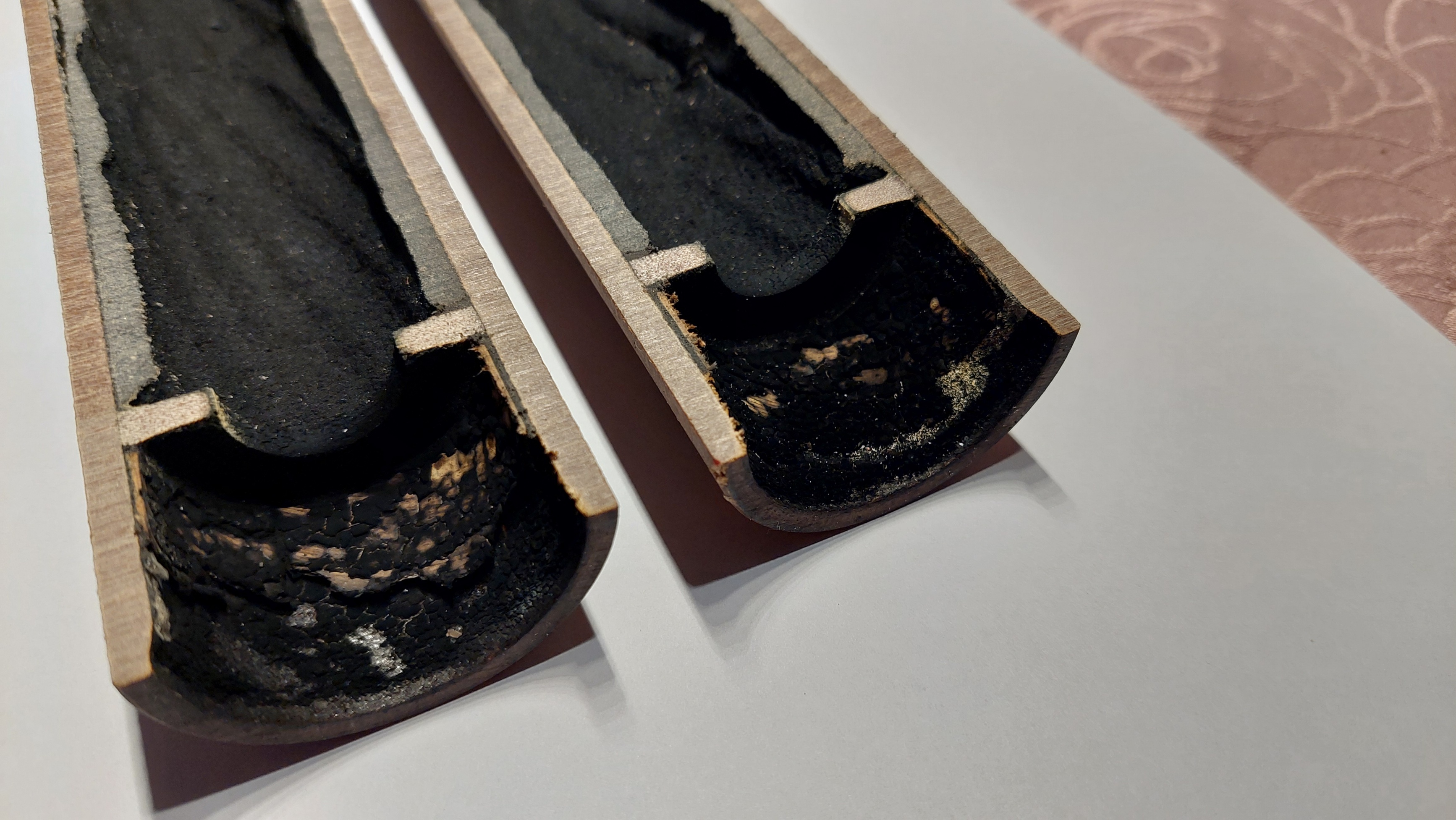 Hier die Grains des Motors, bestehend nur aus Epoxy (Klebstoff) und Paraffin (Kerzenwachs)vor dem einkleben in den Liner...   Fotos von Ralf Und hier nach dem Flug (aufgesägter Reload) Schön zu sehen die sehr gut funktionierende Nachbrennkammer und der doch recht deutliche Abbrand des Treibstoffes...   Geändert von Andreas B. am 21. Oktober 2025 um 23:48