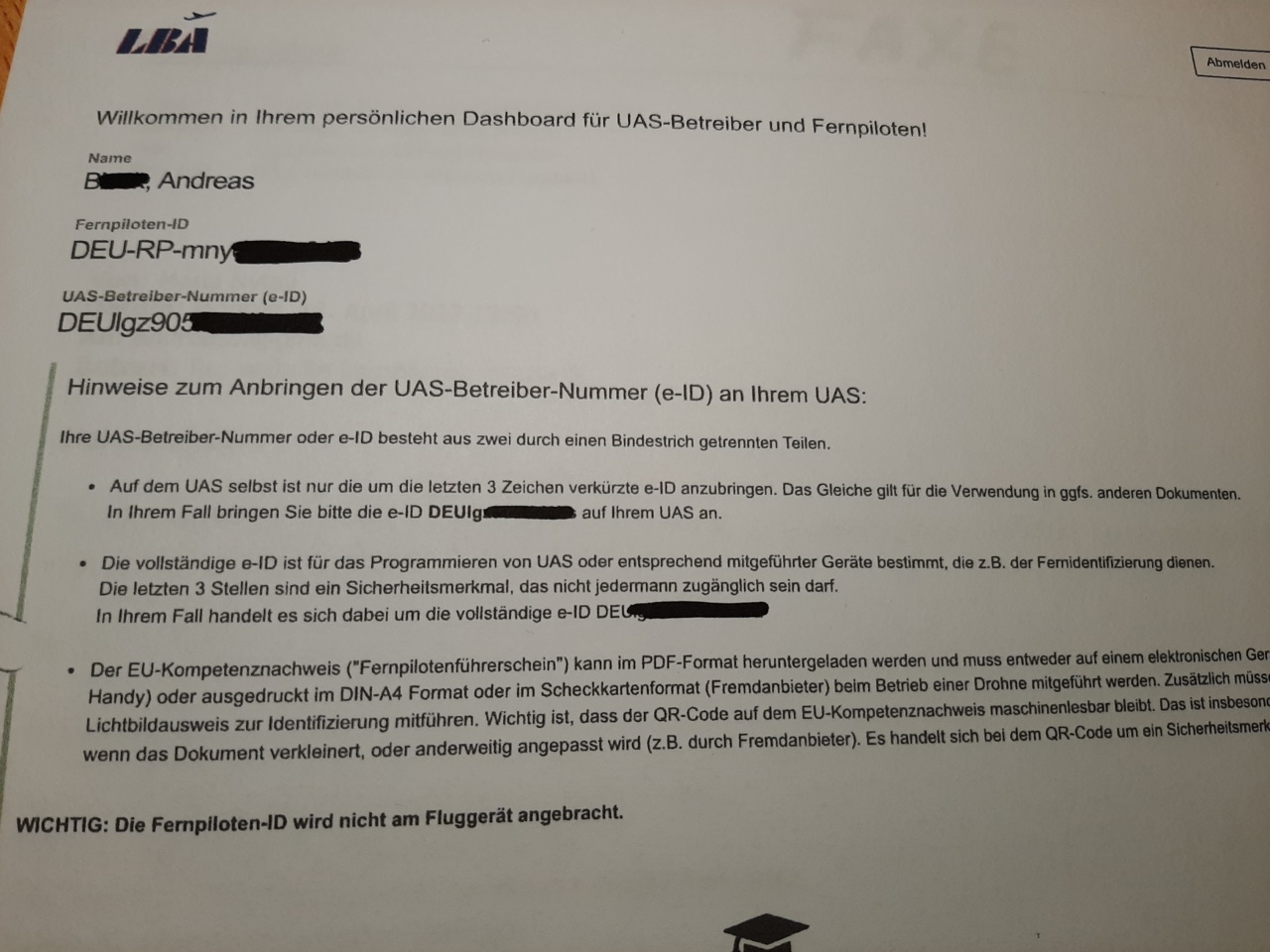 Auf dem zweiten Bild von Andreas steht doch die UAS-Betreiber-Nummer (... und die Fernpiloten-ID).