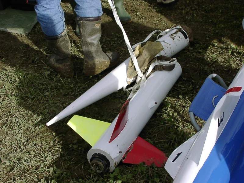 Absolut perfekt vorgeflogen - und zu meinem allergrössten Erstaunen - wurde es <i>leider leider</i> mit der holländischen L2-Nike Smoke (12 kg?) am letzten ALRS, bei der das Bergungssystem komplett versagte: Aber statt dass sie am Gipfelpunkt umdrehte und sich Kopf voran mit 800 km/h im Boden versenkte (und vorher den Kopf versengte? oder heisst das jetzt versängte? wel es vorher so singt im Kopf?) taumelte sie einfach <b>quer</b> vom Himmel nach unten. So erklärt sich auch die relativ geringe Beschädigung - niemand würde glauben, dass diese Rakete ungebremst aus ca. 700 m (?) Höhe vom Himmel gefallen ist. Man sieht an diesem Foto auch, dass sie quer mit einer Flosse eingeschlagen ist.